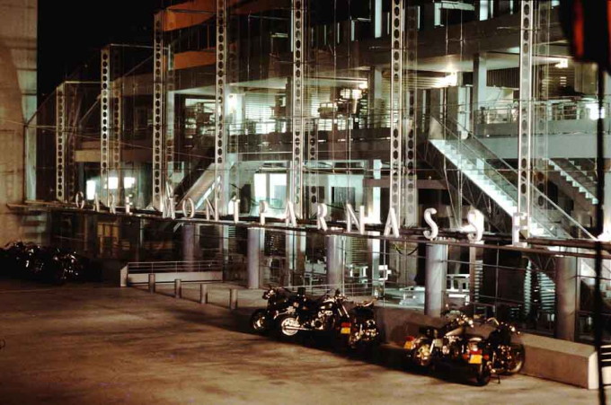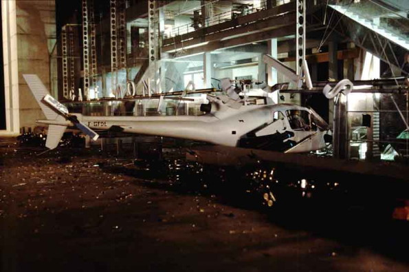 | Ready to turn over | Even though under Bills' supervision, Bill was happy for me to lead the way, with what was basically, a giant architectural model, as I do a lot of Architectural modelmaking inbetween doing film work. Early information described the helicopter exploding, so a 30 foot long , ten foot high, miniature had to be made, so that the scale of the flames did not betray the size of the model, as it was all to be shot 'in camera'. The size of the Helicopter being used also dictated the size of the set too. 'Action man scale' is a term Bill and I often use (I think its about 1:8)so that was the scale of the model. Mostly perspex with a section of real glass in the centre. All the steel work and cables supported the Glass in exactly the same way they do in reality..and seemed like the logical way to construct this. Later information (after the thing was half built) revealed that no fire-ball explosion would be involved and that only the glass would break, meaning this model could have been half this size. |