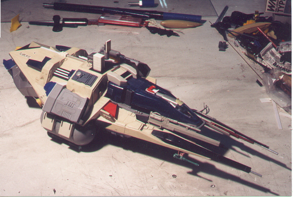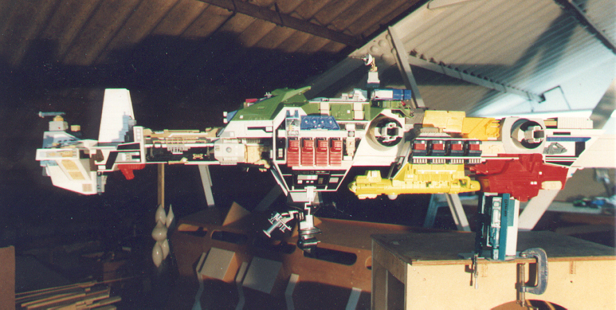 | ..... If I make a model using a lot of bits and bobs, I always take a photo just prior to painting to remind me in years to come just how many and what kind of pieces were involved. On a good day, the right piece goes in the right place, without having to offer up every wigget in the box against every part of the ship. Having a good selection of pieces is half the battle and spreading them out so you can see them all at a glance. Car-boot sales are a good place to buy cheap toys, which can then be butchered to suit...if only the kids could see what we do to their precious toys! The magic part, is how a simple coat of paint brings all those bits of junk together. |