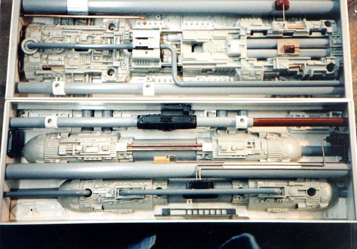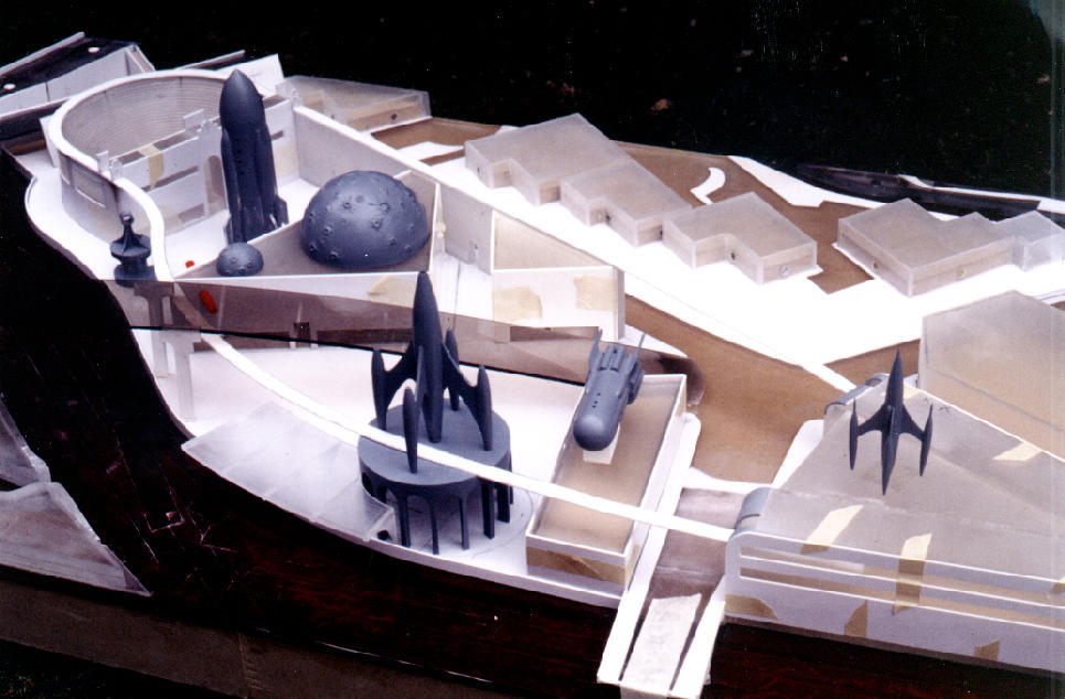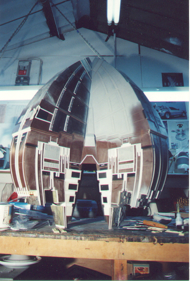 | Nude princess | Main body of freighter 'Princess' before the cargo and engines are applied by the rest of the team and I paint her, (seen on opening page) 5 ft long at 1:200 scale, 2 weeks. Seen in the episode 'The Snake'. Time constraints meant only Head portion followed closely Jim Cornish's production design. Can you spot the red combine harvester? | ||