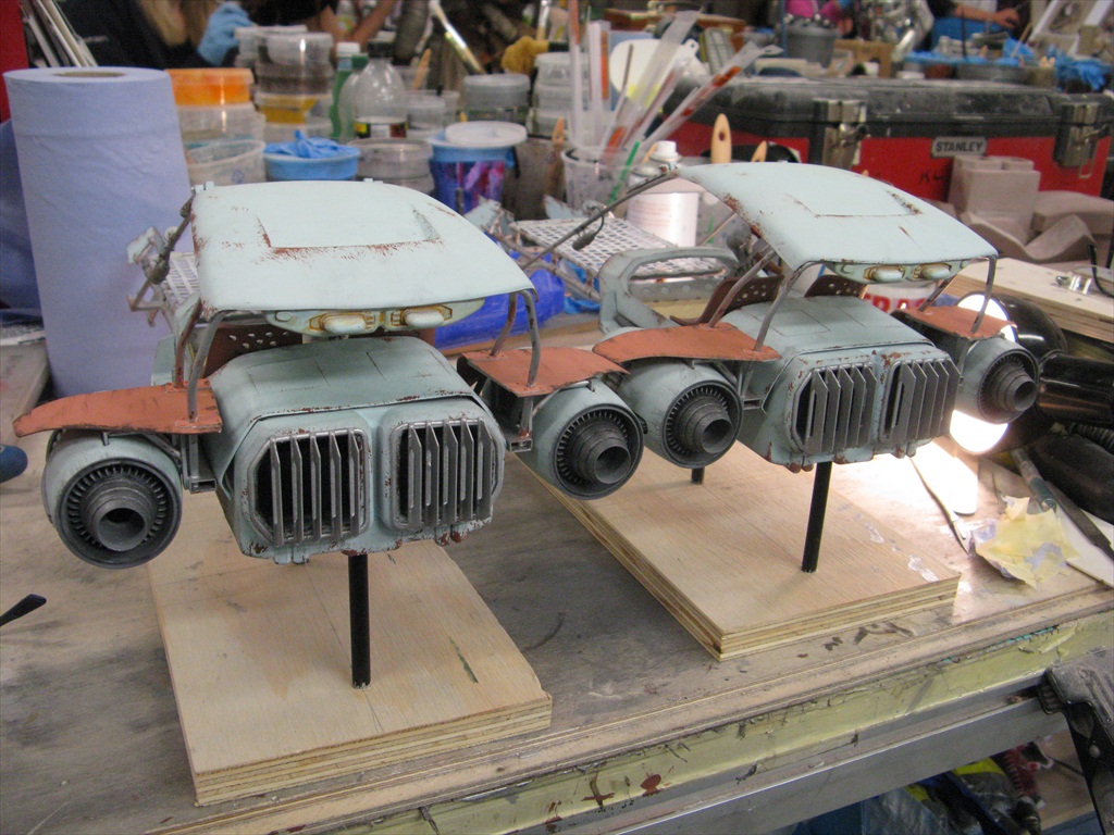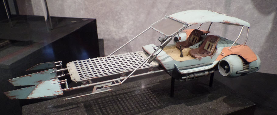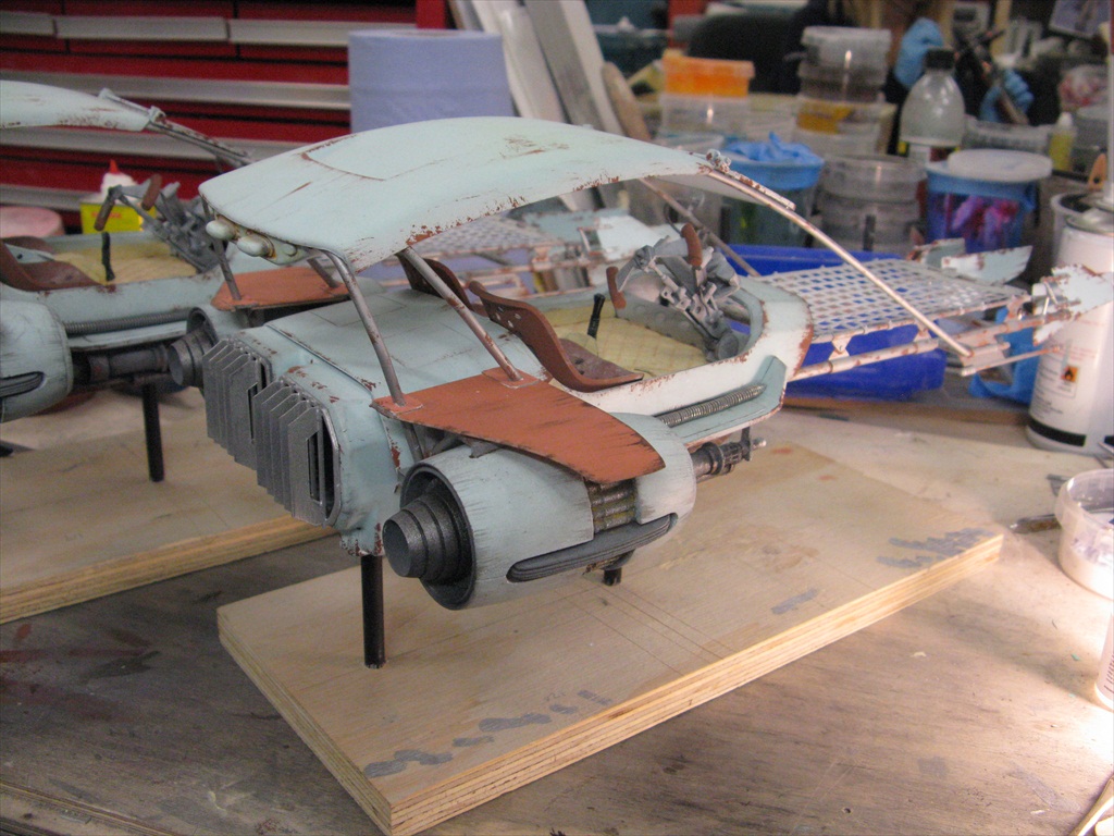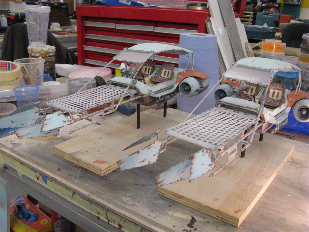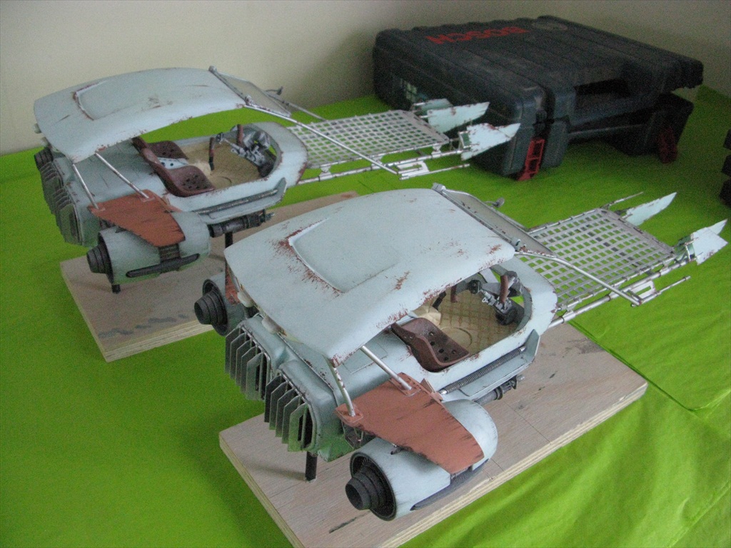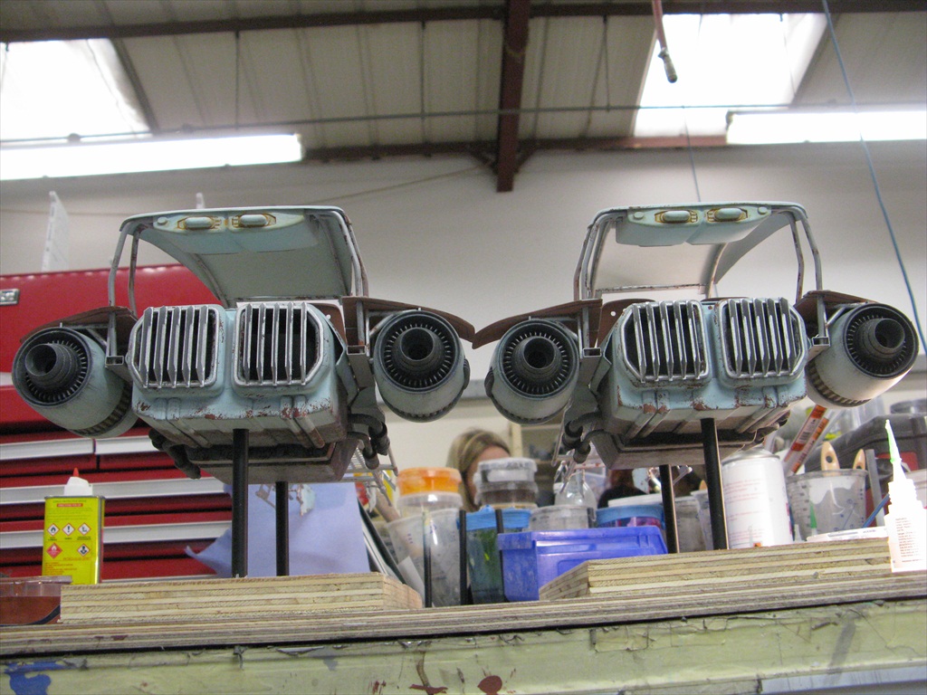 Jakku Speeders Seen briefly in THE FORCE AWAKENS, these two craft were made when the 3D printers were fully occupied and so had to be mostly scratch built. I made all the patterns and vac-formed them and got the basic shape together, figuring out how Chris Trices brass frame would slot into it all. Bill made the screen and things like bucket seats, steering columns and cylindrical engines, were printed. After I made the rear engine fins and the woven matting on the front, I then painted and weathered them and mounted them on stands. Even though you could already buy the design at ARGOS as a micro-machine (first image), utmost secrecy was demanded. Ive waited a long time to share these. Click on an image for a closer look.