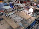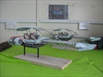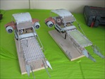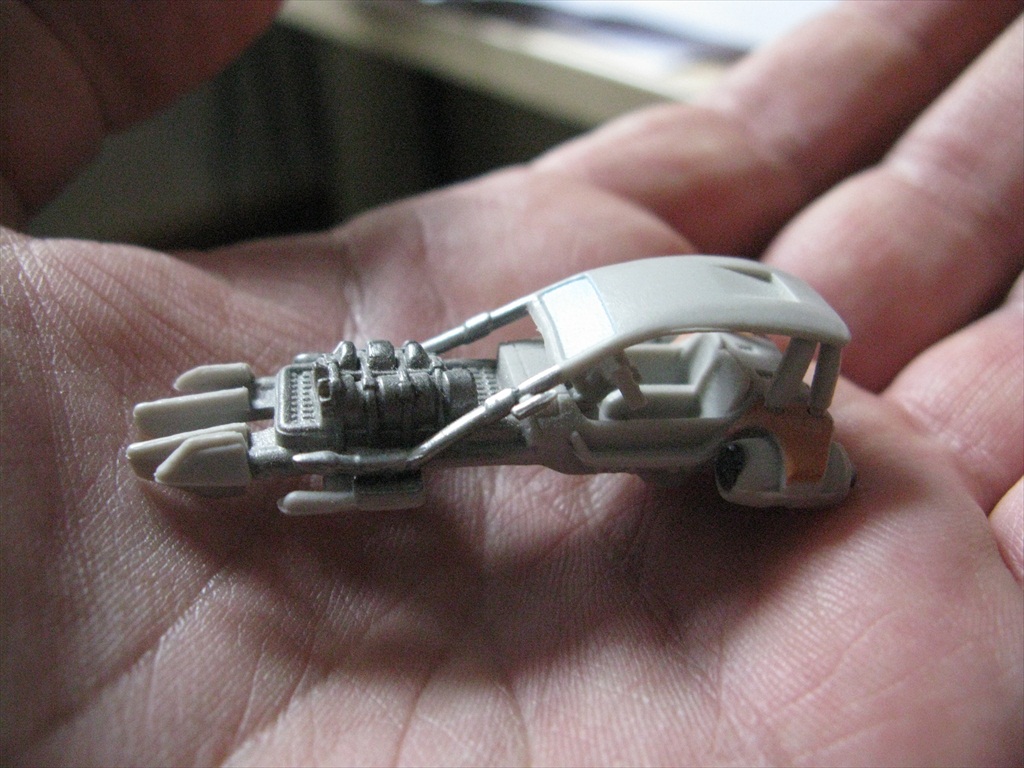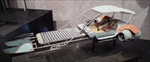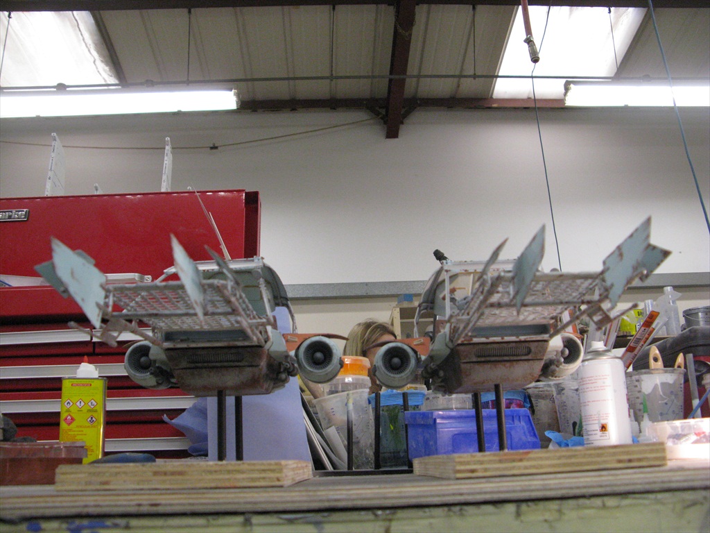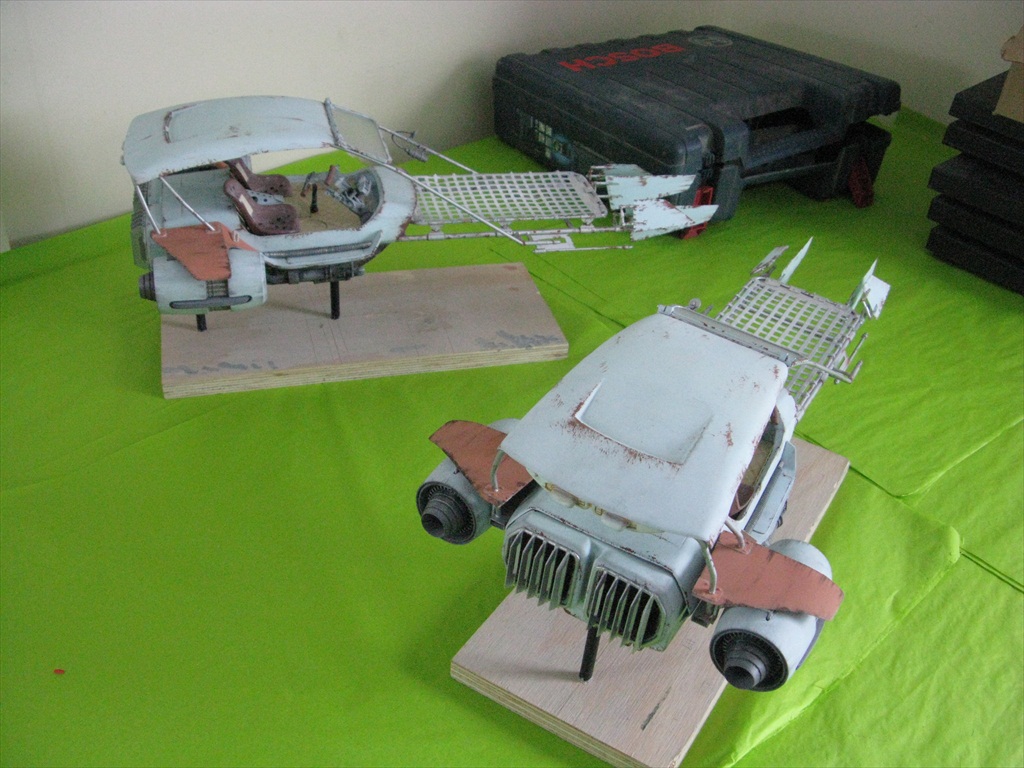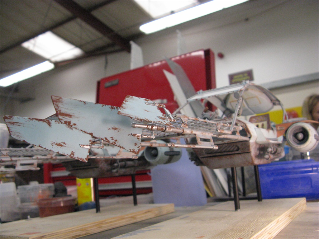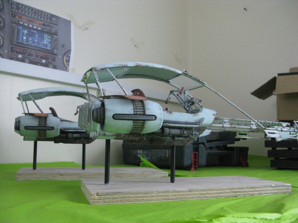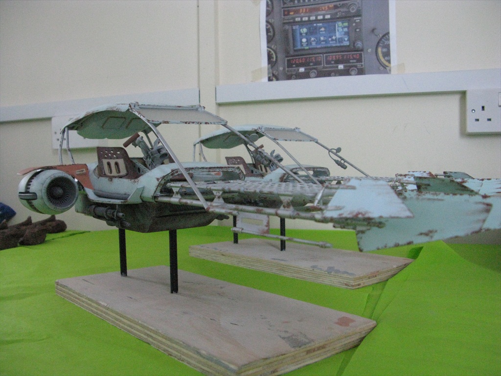 Jakku Speeders Seen briefly in THE FORCE AWAKENS, these two craft were made when the 3D printers were fully occupied and so had to be mostly scratch built. I made all the patterns and vac-formed them and got the basic shape together, figuring out how Chris Trices brass frame would slot into it all. Bill made the screen and things like bucket seats, steering columns and cylindrical engines, were printed. After I made the rear engine fins and the woven matting on the front, I then painted and weathered them and mounted them on stands. Even though you could already buy the design at ARGOS as a micro-machine (first image), utmost secrecy was demanded. Ive waited a long time to share these. Click on an image for a closer look.
